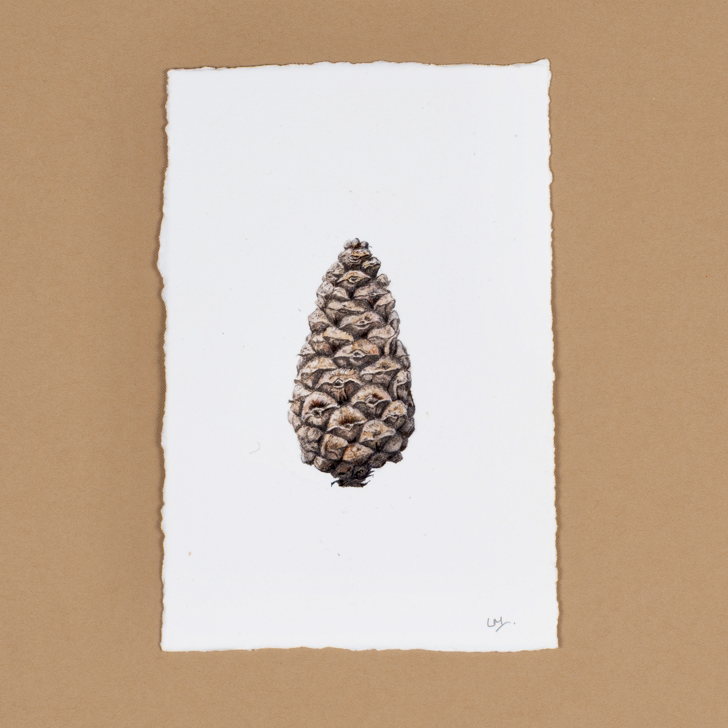 A small study of a pine cone collected from a stand of Scots Pine at Rosemarkie Beach. A friend told me that his mother called this group of trees “the plantation”. The stand is home to countless crows, who have established a busy rookery in the branches. This corvid community has thrived for many years.